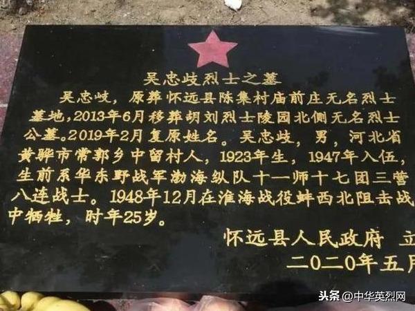 5月28日,在安徽省蚌埠市怀远县陈集镇的淮海战役蚌西北阻击战烈士陵园内,举行了一场为烈士立碑仪式,两名已牺牲了70多年的沧州籍烈士吴忠岐和孙金连,名字被正式刻在单独墓碑上,他们为新中国解放事业献身的革命事迹,今后将被更多人所熟知。