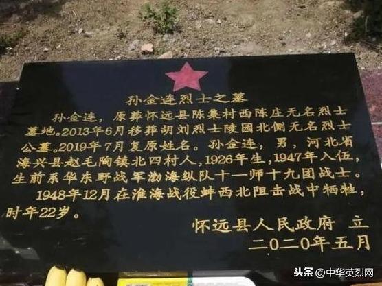 当天,两位烈士的亲属分别从黄骅、北京、承德等地来到了蚌西北阻击战烈士陵园,一起见证这一肃穆时刻。记者在安徽方面提供的现场图集上看到,新立的碑上刻着烈士的姓名、祖籍、生前部队番号、牺牲时间以及牺牲经过等,碑上最后标着“怀远县人民政府立2020年5月”。“我们能有今天的和平幸福生活,离不开先烈们抛头颅、洒热血,他们的英雄事迹,将会教育激励更多的人。”孙金连烈士的外甥、现年63岁的杨金池老人对记者说。