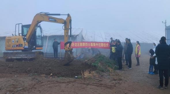 上午8时,在烈士家属、文物部门的共同参与下,散葬烈士墓动迁工作在蒲山镇黄山村黄山遗址启动,工作人员对烈士墓小心翼翼挖掘。随后,烈士家属仔细收敛烈士遗骨,工作人员在棺椁上覆盖国旗,并运送至南阳市卧龙区烈士陵园安葬。