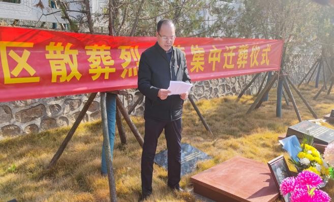 郭超同志在致辞中,对烈士家属表示诚挚的问候,并对他们理解、支持、配合烈士迁葬工作表示衷心的感谢。同时指出,在革命战争年代,无数革命者为民族独立、人民解放抛头颅、洒热血,献出了自己宝贵的生命,谱写了悲壮的青春华章,换来了我们今天来之不易的安定团结和幸福生活。张金桂、张金荣等烈士,有的长期潜伏从事党的地下工作,有的冒着枪林弹雨冲锋在浴血战场,在南阳解放前夕献出年轻的生命,他们的精神永远值得我们铭记,永远值得我们尊崇。下一步,退役军人事务部门将加强烈士纪念设施的修缮维护和管理,充分发挥英雄烈士纪念设施铭记历史、缅怀英烈、教育后人的红色阵地作用,进一步营造崇尚英烈、学习英烈、捍卫英烈的社会氛围,激励更多的人沿着烈士足迹砥砺前行。