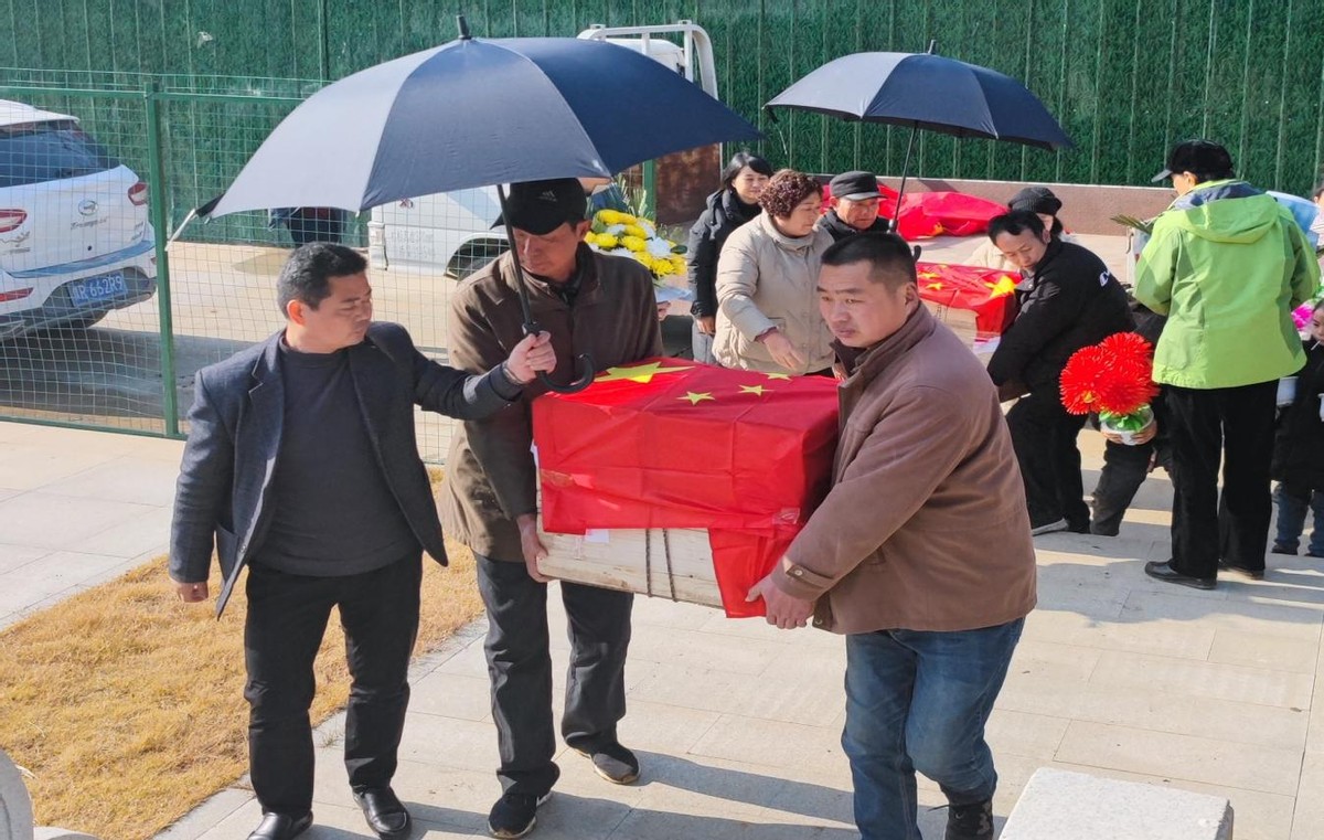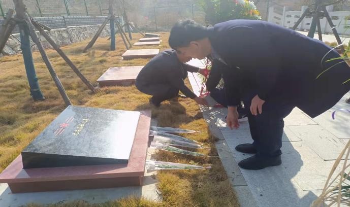 随后,工作人员为烈士墓安放墓碑,现场人员向烈士墓鞠躬、献花,寄托哀思。