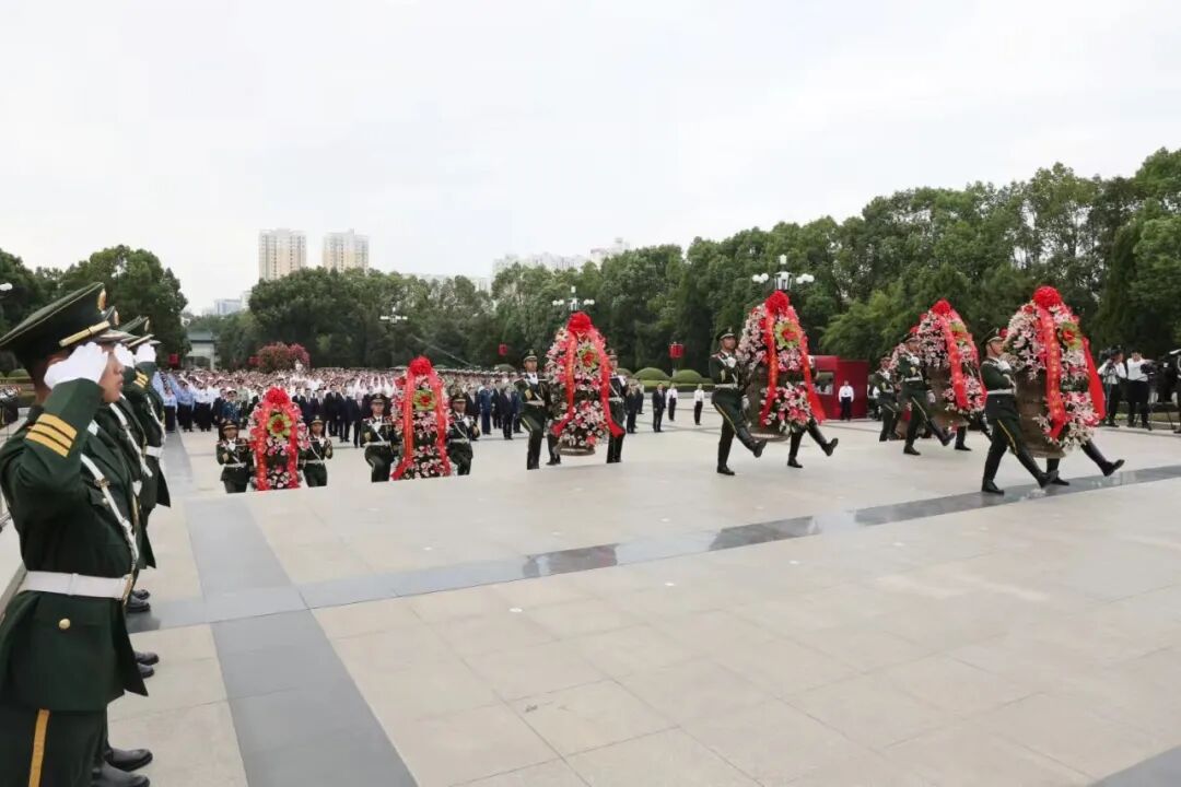 苍松翠柏掩映下的纪念园广场,五星红旗迎风飘扬,革命烈士纪念碑巍然耸立。省领导与老战士、烈属、劳模、先进人物和驻鄂部队官兵、机关干部、学生等各方面代表,面向纪念碑列队肃立,现场庄严肃穆。