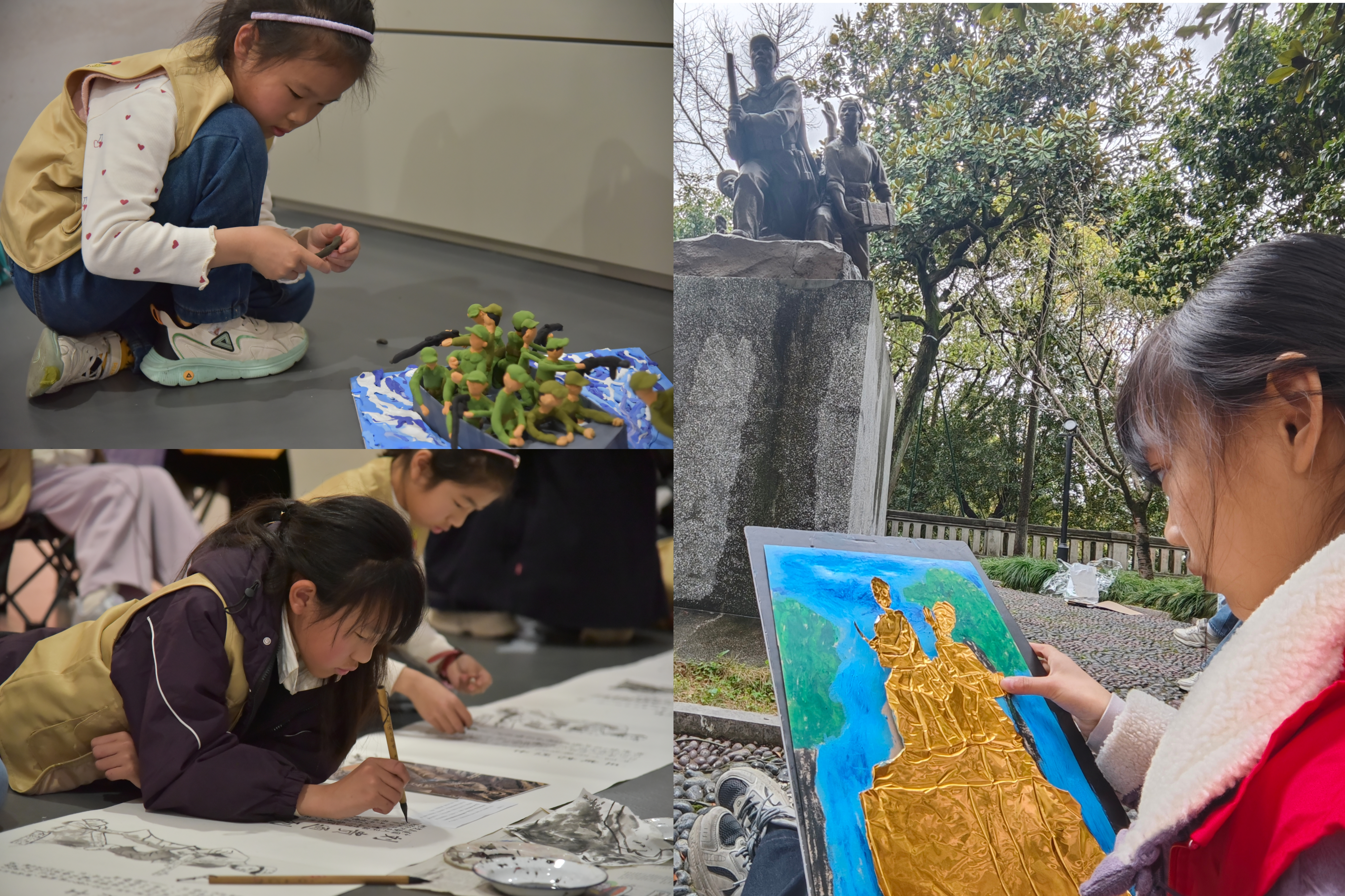 随后,孩子们分组进入水墨长卷区、彩笔写生区、红色泥塑区,在专业老师的指导下开启艺术创作。大家挥毫泼墨勾勒英雄模样,执笔写生定格群雕风采,巧手捏塑还原战斗场景,用水墨、彩绘、泥塑等多样形式,将对英烈的崇敬与哀思融入作品之中。