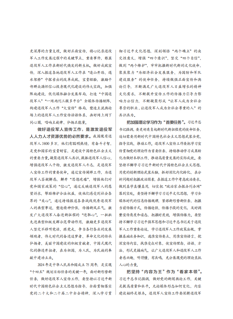 2024年是中华人民共和国成立75周年,是实现“十四五”规划目标任务的关键一年。面对新形势新任务,做好退役军人宣传工作,要坚持以习近平新时代中国特色社会主义思想为指导,全面贯彻落实党的二十大和二十届二中全会精神,深入学习贯彻习近平文化思想,深刻领悟“两个确立”的决定性意义,增强“四个意识”、坚定“四个自信”、做到“两个维护”,牢牢把握新时代新的文化使命,聚焦聚力“为经济社会发展服务、为国防和军队建设服务”的使命任务,持续做强正面宣传和舆论引导,不断满足广大退役军人日益增长的精神文化需求,不断提升宣传工作的传播力引导力影响力公信力,不断凝聚形成“让军人成为全社会尊崇的职业,让退役军人成为全社会尊重的人”的共识共为。