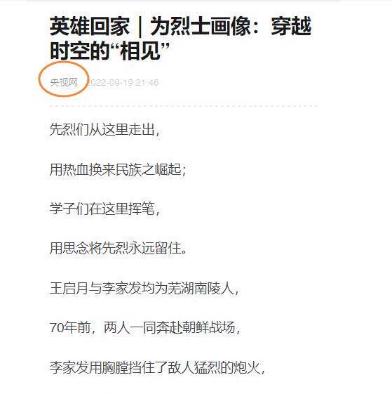 9月19日,芜湖新闻网推出“力作”《英雄回家|为烈士画像:穿越时空的“相见”》,讲述安徽师范大学美术学院青年志愿者为烈士画像,让芜湖籍抗美援朝志愿军老战士王启月与李家发烈士“圆梦”合影的故事。这件融文、图、视频作品于一体的融媒体报道,引发了强烈的社会反响。国内各大主流媒体纷纷予以转载,网友转发、评论热情高涨。