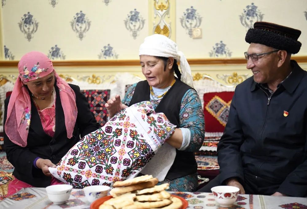 9月4日,巴依卡老人(右)在家中休息,他的老伴帕热扎·加依克(中)在绣制靠垫套。新华社记者 (程婷婷 摄)