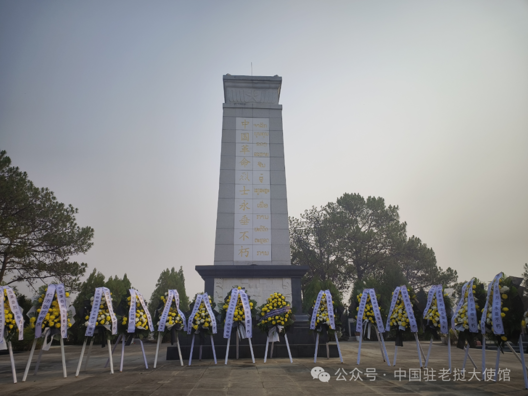 驻老挝使馆、驻琅勃拉邦总领馆、川圹省委省政府等单位和华人华侨代表向烈士纪念碑敬献花圈。全体人员鞠躬默哀,整理挽联,祭扫烈士墓,气氛庄重肃穆。