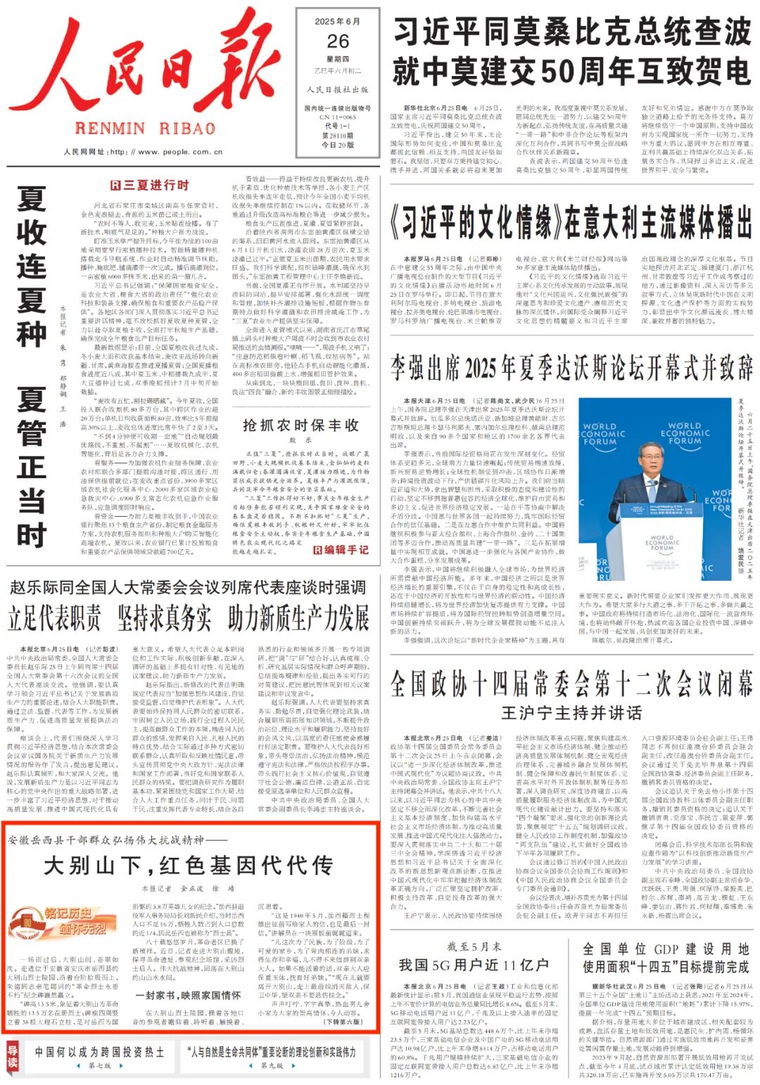 6月26日,《人民日报》头版“铭记历史 缅怀先烈”栏目刊登 “安徽岳西县干部群众弘扬伟大抗战精神——大别山下,红色基因代代传” 文章。