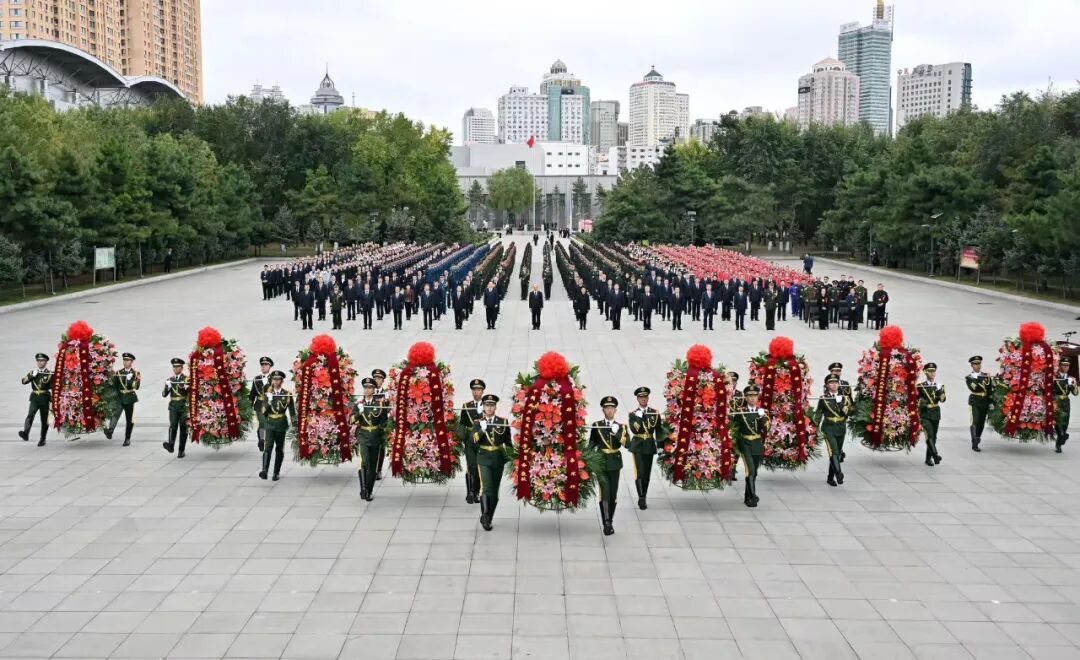 省及哈尔滨市各界代表向烈士纪念塔敬献鲜花。