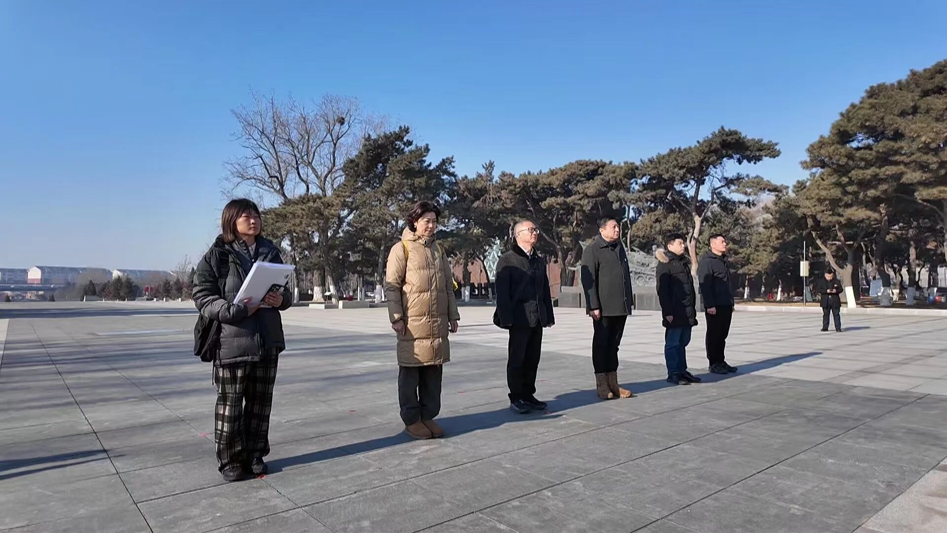 在苍松翠柏掩映下的纪念广场,全体人员整齐列队、神情肃穆。伴随着雄壮的《中华人民共和国国歌》,大家肃立致敬,向抗美援朝烈士默哀,向英烈三鞠躬。随后,祭扫团成员来到刻有钱坤华烈士名字石碑前,摆上家乡带来的特产与泥土,将对家乡英烈的深切缅怀融入每一个细节。