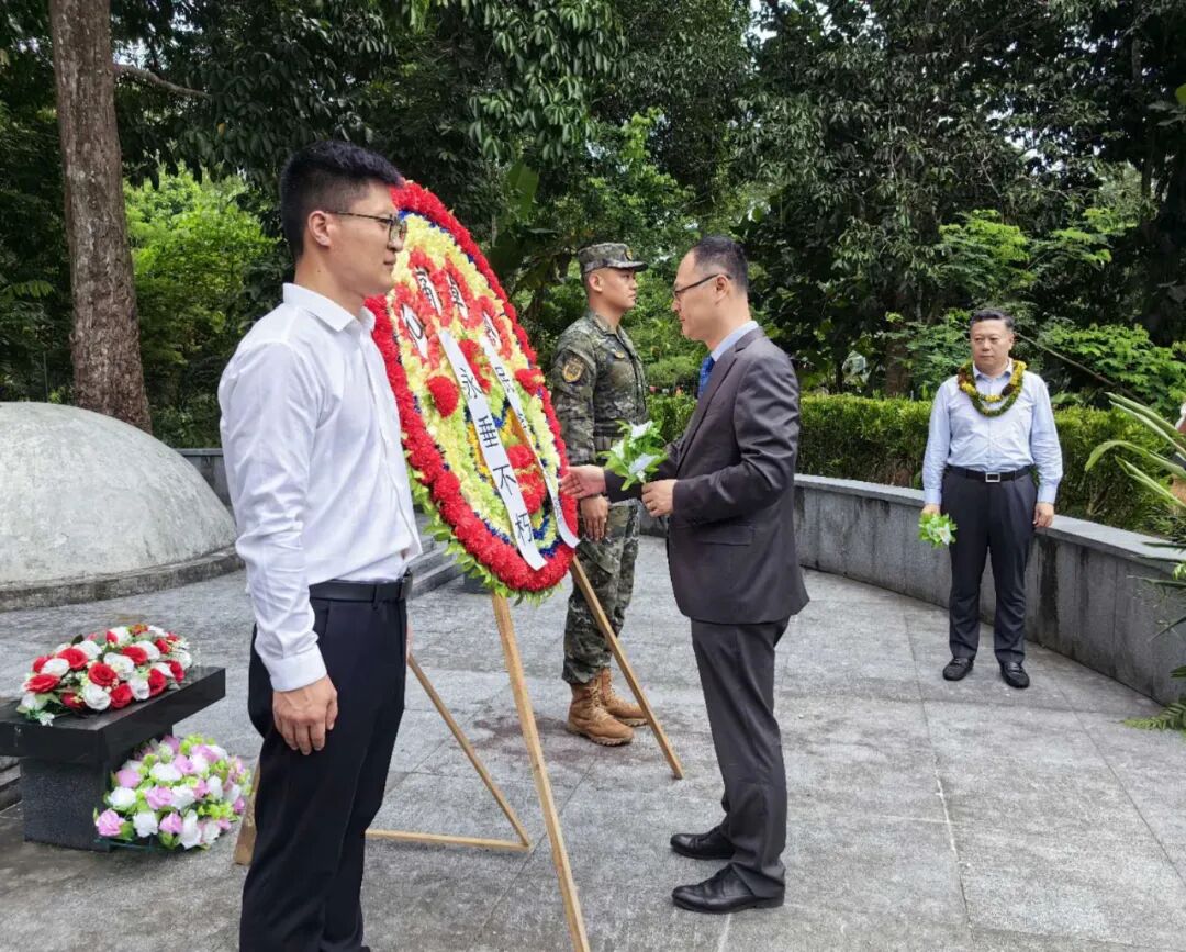 姜成森参赞代表使馆向遇难将士墓碑敬献花圈,并带领全体人员向抗战将士和遇难同胞鞠躬默哀。姜表示,要铭记先烈为国家和民族作出的牺牲和奉献,牢记历史,珍爱和平。姜并向陵园看护人员表示慰问,感谢他们对陵园的悉心维护。期间,姜成森参赞还率队赴当地中资企业项目和华商店铺走访调研,看望慰问企业员工和华侨华人,并为当地侨胞提供异地领事办证服务。